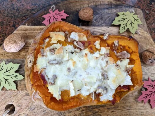 Butternut stuffed with goat cheese, bacon and walnuts