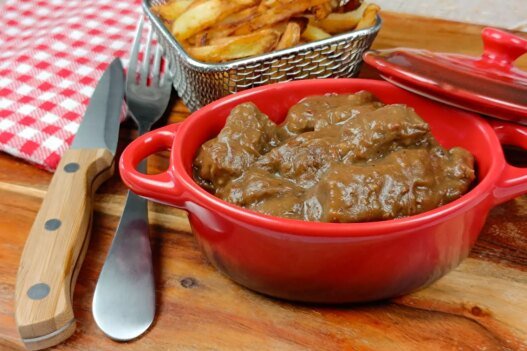 After cooking for 3 hours in an oven at 180°C, you obtain a competitive Flemish carbonade, capable of warming you up in just two bites.
