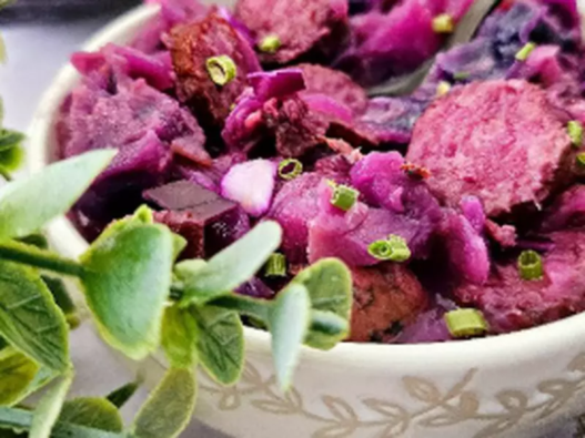 A comforting stew, rich in flavors, combining red cabbage, beech wood smoked sausages and melting chestnuts. A simple family dish to prepare and ideal for cool days.